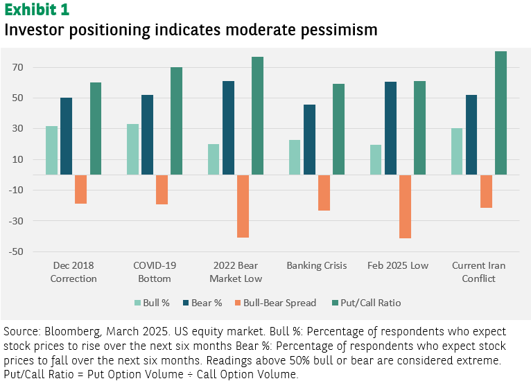 Current investor positioning reveals a market caught between rebound expectations and caution. The relatively less pessimistic sentiment, along with elevated hedging activity, suggests investors are positioned protectively, in expectation for sentiment to gradually normalise. This cautious positioning could provide fuel for a market rally, based on possible catalysts for a de-escalation of the Middle East conflict, as heavily hedged markets often experience sharp gains when fear subsides, and protective positions are unwound. Short-term volatility could eventually give way to a rebound, as the market re-centres around the fundamental growth picture, which for now has not been altered.