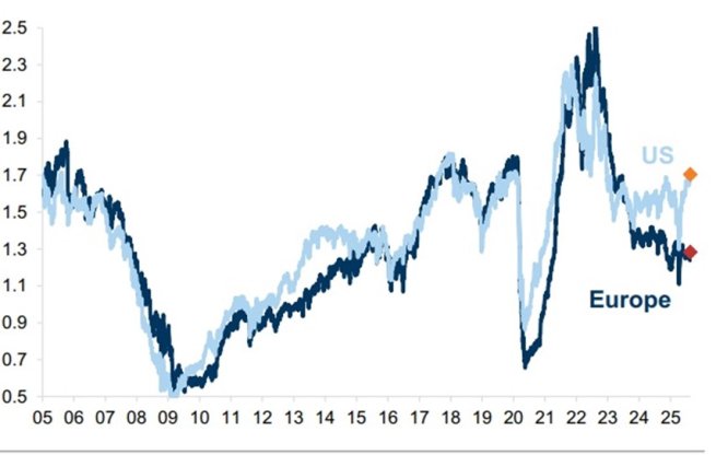 Natürlich waren europäische Aktien zu Jahresbeginn sehr viel günstiger bewertet als US-Titel. Die lange Zeit recht extreme Bewertungslücke ist aufgrund der guten Konjunktur und der staatlichen Ausgabenpläne zwar etwas geschrumpft, doch sind die Bewertungen noch immer niedriger als in den USA. Dort stiegen sie dieses Jahr gleich mehrmals auf neue Rekorde.
