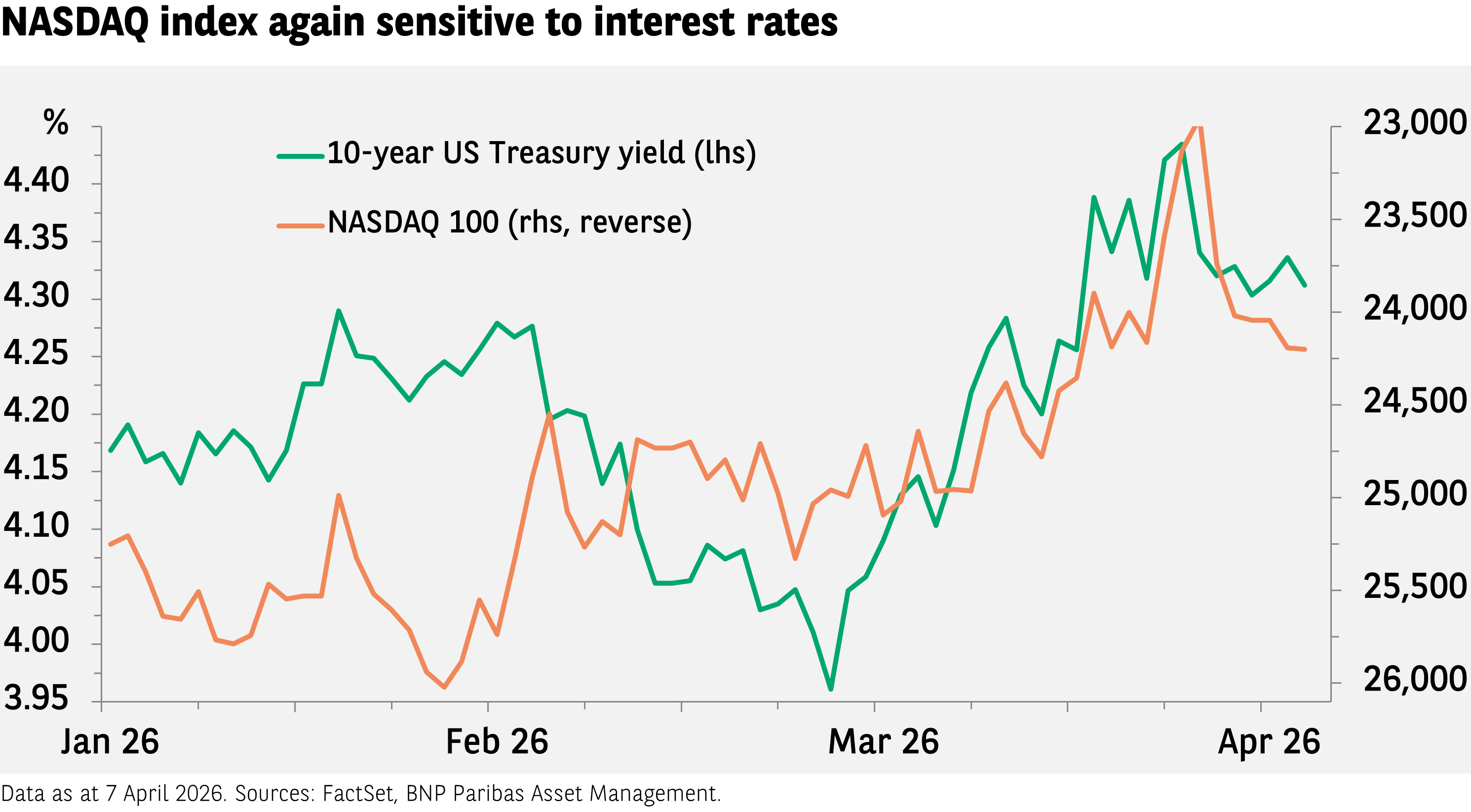 Ein entscheidender Faktor für die Performance von Technologieaktien sind natürlich die Unternehmensgewinne, aber die Bewertungen fallen ebenfalls ins Gewicht, weshalb auch die Zinsen eine wichtige Rolle spielen. Besonders deutlich zeigte sich dies 2022, als die Zinsen aufgrund der Inflation nach der Corona-Pandemie stiegen und der NASDAQ 100 plötzlich einbrach. Noch bis vor kurzem wurde dieser technologielastige Aktienindex hauptsächlich von erhofften Erträgen aufgrund der KI-Entwicklungen beflügelt. Zuletzt haben jedoch die steigenden Zinsen sowie die Inflationssorgen den NADAQ ins Taumeln gebracht. Sollte sich die Situation im Nahen Osten weiter entspannen, könnten die Zinsen wieder sinken, was dem Index Auftrieb geben dürfte.