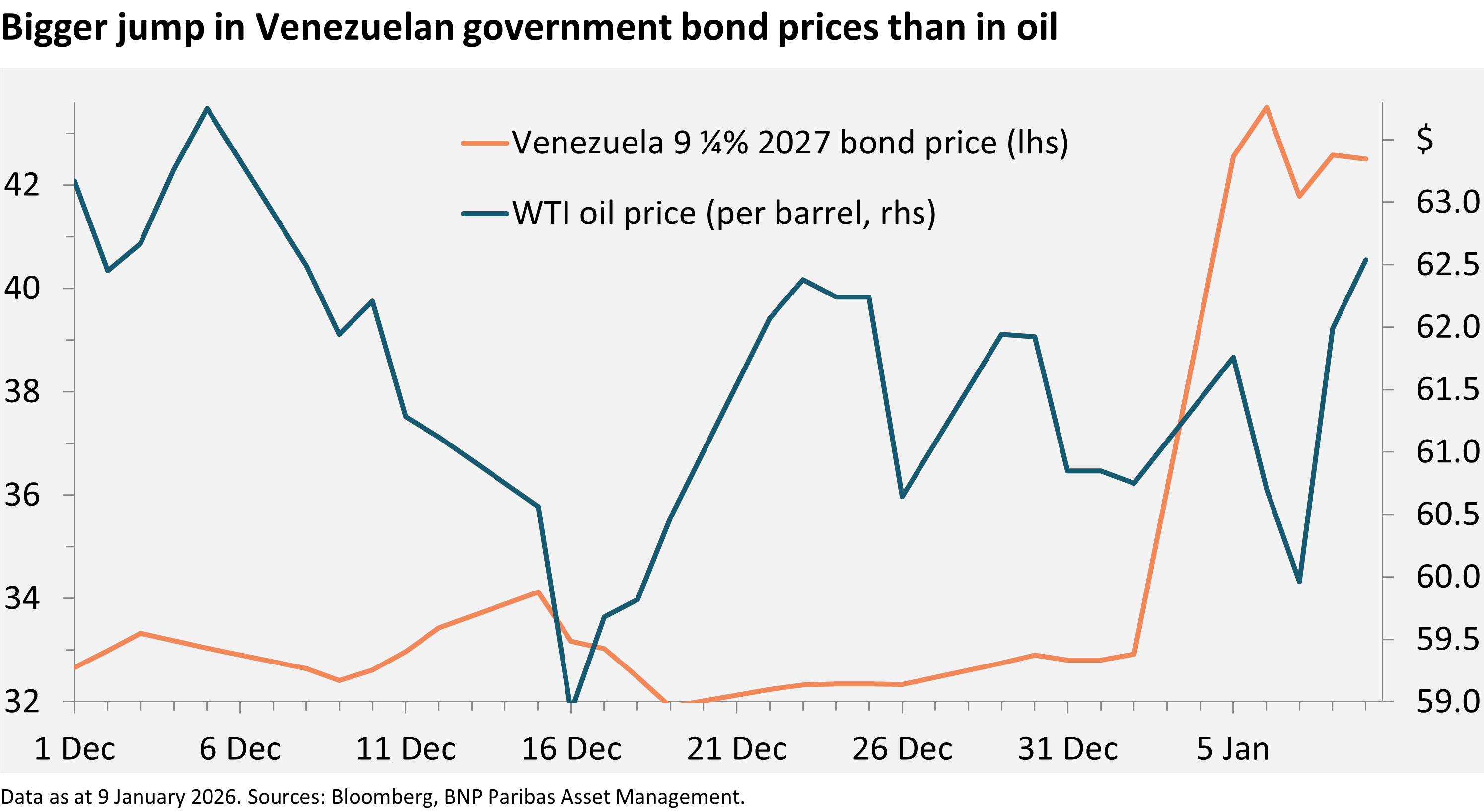 Eine Neujahrsüberraschung wurde den Anlegern mit der Festnahme des venezolanischen Präsidenten Nicolás Maduro beschert. An den Märkten wurde diese Nachricht überwiegend positiv aufgenommen. Die Aktienkurse der grossen US-Mineralölkonzerne legten zu, und venezolanische Staatsanleihen schossen in die Höhe. Beim Ölpreis führte ein Wechselspiel aus Sorgen mit Blick auf mögliche kurzfristige Versorgungsstopps und geopolitische Risiken einerseits und dem Ausblick auf eine Angebotsausweitung dank US-Investitionen, die eines Tages in diesem Sektor getätigt werden könnten, andererseits zu erheblichen Schwankungen. Venezuela verfügt zwar über die weltweit grössten Ölreserven, jedoch nur über eine vergleichsweise geringe Produktion. Diese betrug zu Spitzenzeiten vor zwei Jahrzehnten drei Millionen Barrel pro Tag, während es derzeit weniger als eine Million Barrel sind. Eine Rückkehr zum früheren Niveau, die erst auf lange Sicht möglich wäre, würde die weltweiten Fördermengen um lediglich 2 % anheben.
