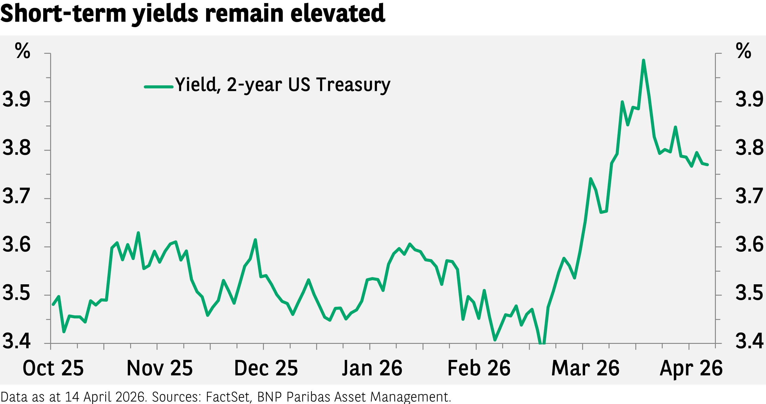 Seit der Ankündigung einer zweiwöchigen Waffenruhe im Nahen Osten haben sich die Aktienmärkte merklich erholt. Die Renditen kurz laufender Anleihen bleiben allerdings hoch; so rentieren US-Treasuries mit zweijähriger Laufzeit noch immer bei rund 3,80%. Ausschlaggebend für die Renditen kurzfristiger Anleihen sind die Zinserwartungen. Angesichts gestiegener Energiepreise und des Inflationsschocks sind die Hoffnungen auf eine expansivere US-Geldpolitik im Jahr 2026 verflogen. Die Finanzierungsbedingungen werden derzeit gestrafft, sodass sich die Rahmenbedingungen für US-Verbraucher und -Unternehmen verschlechtern.