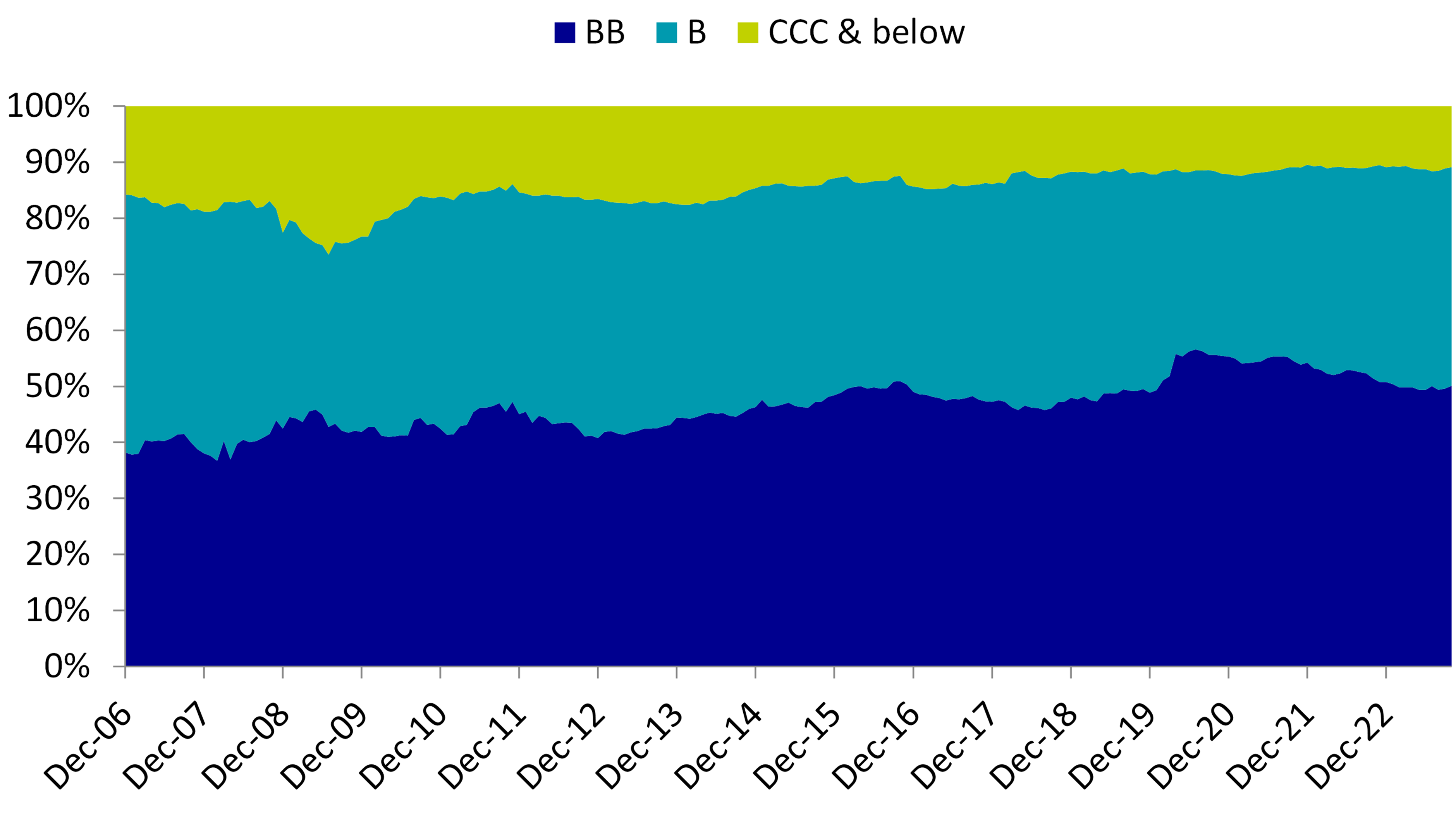 Und dieser Ansatz muss kein Kompromiss sein. Erstens wurden in den letzten Jahren zahlreiche US-High-Yield heraufgestuft.1 Zugleich wurden auch viele Investmentgrade-Anleihen auf BB heruntergestuft.2 Deshalb besteht der insgesamt 880 Emittenten3 umfassende US-High-Yield-Markt heute zu nur 11% aus Anleihen mit einem Rating von höchstens CCC. 49% und 40% entfallen auf Papiere mit BB- und B-Rating. Die folgende Abbildung zeigt, dass die Anleihen mit den niedrigsten Ratings gemessen am Marktwert schon immer der kleinste Teil des Marktes waren. In besonders schwierigen Phasen wie nach der internationalen Finanzkrise (2009) und nach der Herabstufungswelle von Energieunternehmen (2017) bestand der Markt zu 26% und 15% aus Papieren mit Ratings von höchstens CCC. Der zurzeit aussergewöhnlich niedrige Anteil von CCC-Anleihen ist ein Zeichen für gute Fundamentaldaten. Er bedeutet aber auch, dass BB/BBB-Investoren gemessen am Marktwert noch immer etwa 90% des Gesamtmarktes für Anlagen zur Verfügung stehen.